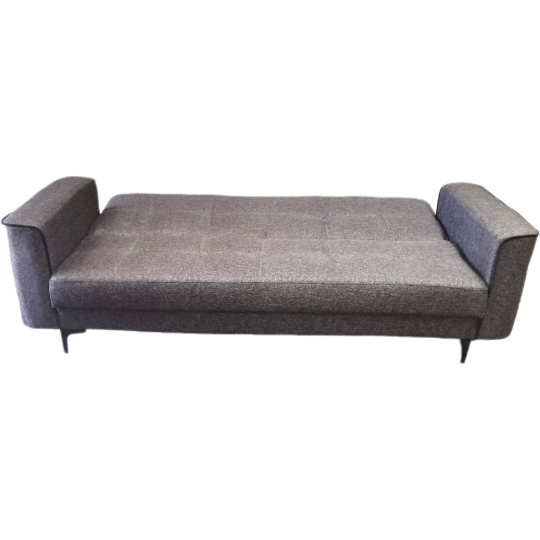 This a MODERN fabric with a minimalist design, featuring a straight backrest and seat cushion accented by subtle square tufting. It has wide armrest and stands on four short, angled legs, offering a clean, contemporary that suits a variety of living spaces.