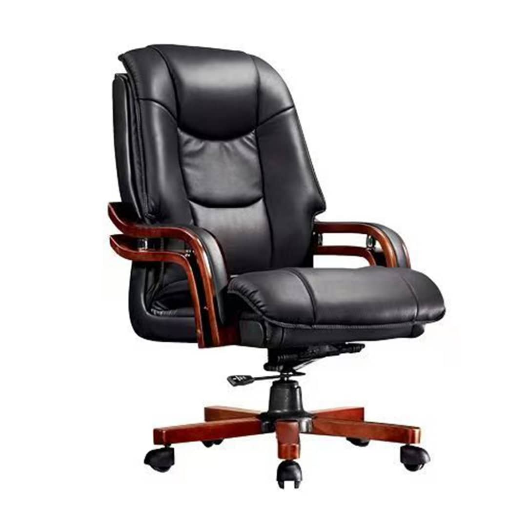 This executive office chair exudes sophistication and comfort. Wrapped in sleek black leather with rich wooden accents, it combines luxury with functionality. The high backrest and plush cushioning offer excellent support, while the swivel base and adjustable height ensure ease of movement. A refined choice for any workspace.