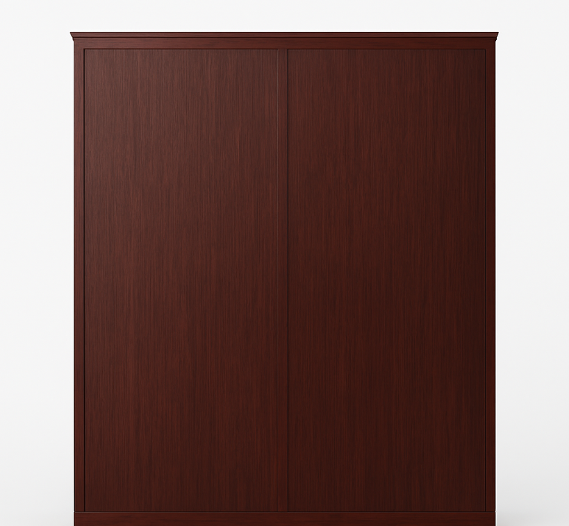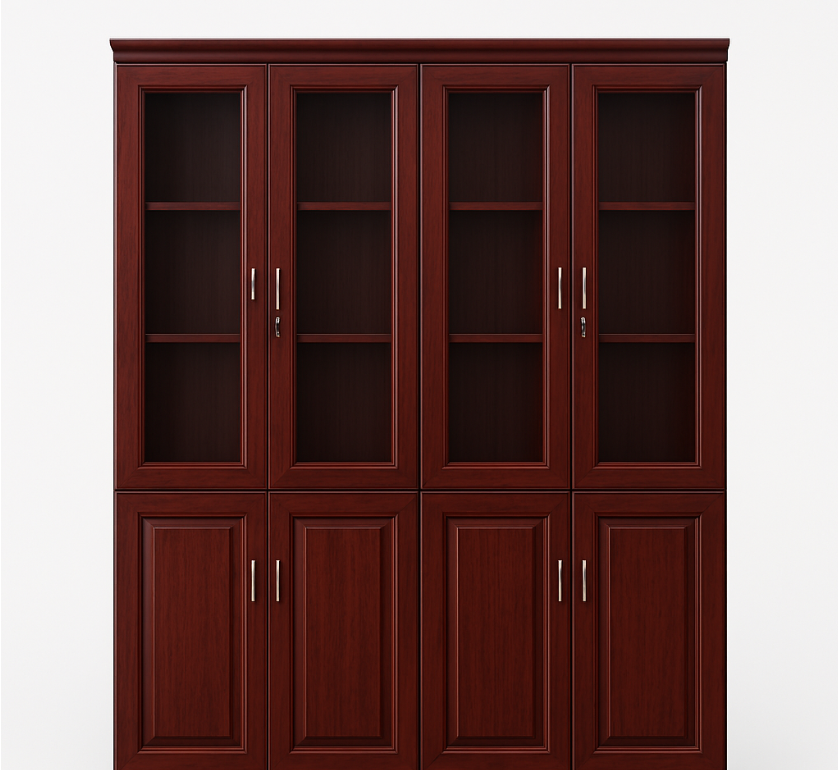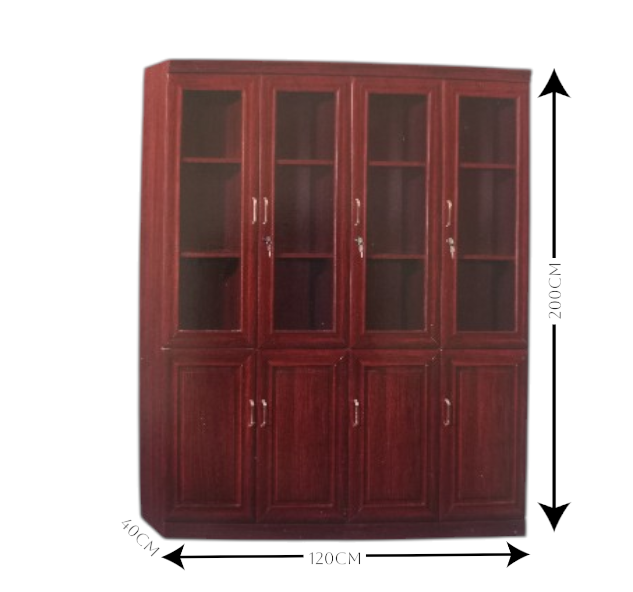 Features a polished dark brown wooden finish with four vertical sections that combine a lockable glass-panel upper doors and shelves display with solid lower doors concealed storage, sturdy handles for ease of use.
